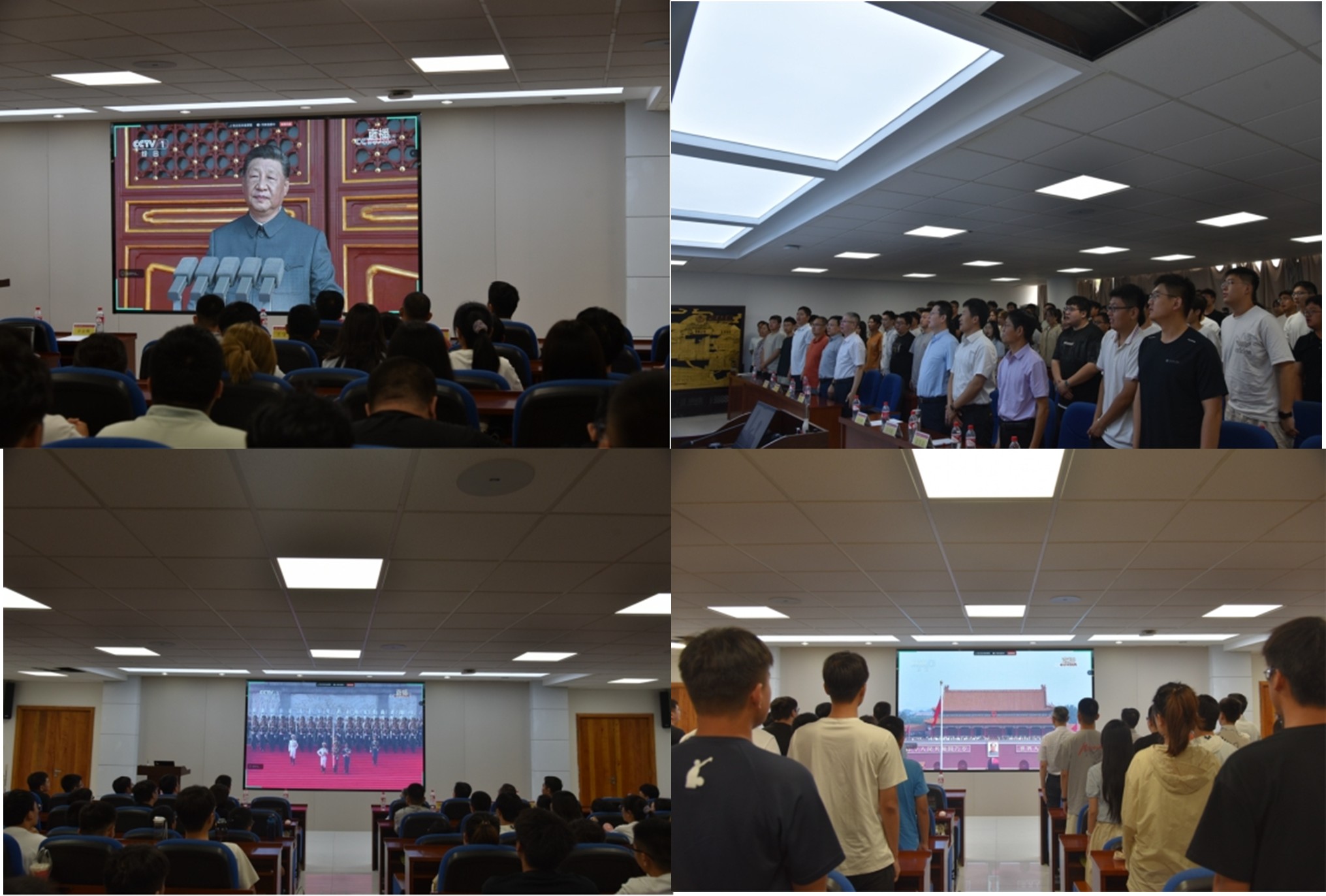 见面会后,学院领导班子与全体新生共同观看纪念中国人民抗日战争暨世界反法西斯战争胜利80周年阅兵式。庄重激昂的氛围中,新生们回顾抗战历史,感受先辈奉献精神,目睹国家先进装备与威武之师,爱国热情与民族自豪感被深深激发,更坚定了以科研报国、助力国家科技发展的信念。