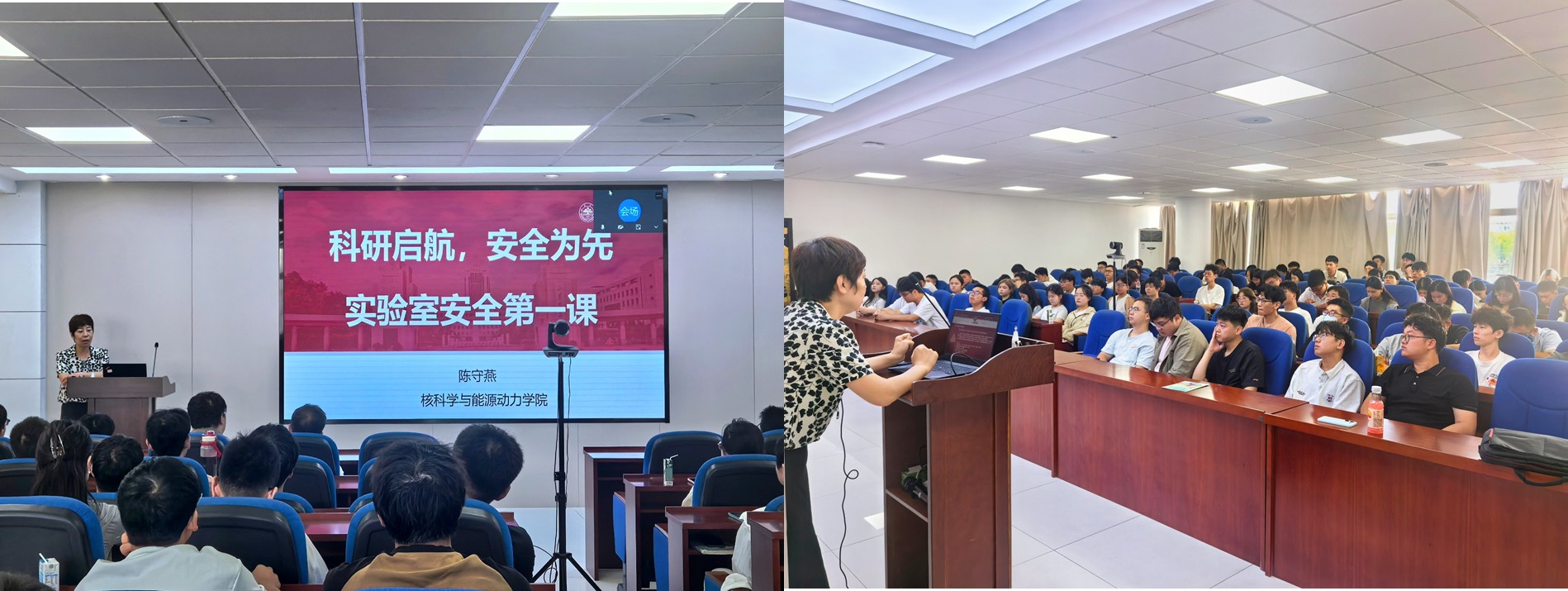 学院高级实验师、硕士生导师陈守燕老师以“科研启航,安全为先”为题开展实验室安全专题讲座,结合学院专业特点梳理实验室常见安全隐患,通过真实案例剖析化学品泄漏、高温高压设备操作不当、电气安全及辐射防护等事故诱因,详细讲解应急处理流程与自救互救技能,强调“安全第一、预防为主”,要求新生养成实验前预习、实验中记录、实验后整理的良好习惯,从源头杜绝安全隐患。
